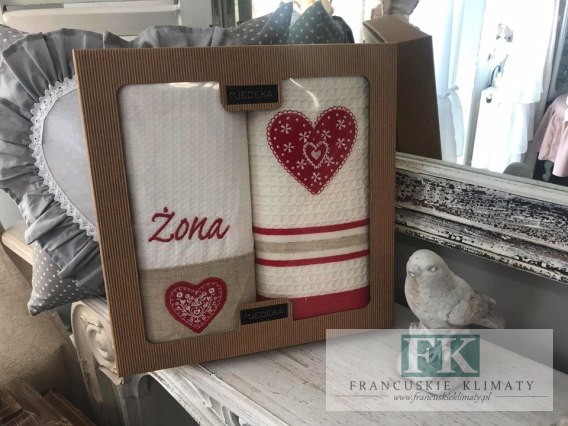 Komplet ścierek bawełnianych, z aplikacjami w serca i napisem "ŻONA". Ścierki maja doszywane elementy lniane, naszywane serduszka haftowane, a opakowane są w niezwykle elegancki karton, co sprawia, ze będą świetnym, ekologicznym, symbolicznym prezentem niezobowiązującym. Ścierki mają wymiary 70,5 x 48,5, w opakowaniu jest 2 sztuki.
