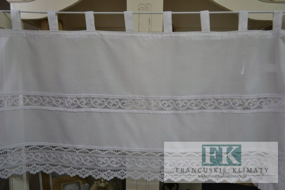 OPIS : Zazdrostka cięta z metra , wykonana na szelkach z wysokogatunkowej tkaniny etaminy (batyst). Przyozdobiona dwoma pasami ślicznej gipiury: węższy pas gipiury wszyty pośrodku  i dolny szeroki pas gipiury - wykończenie zazdrostki