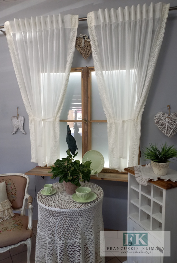 OPIS: Dekoracyjna firana uszyta w formie 2 szali z wysokiej jakości tkaniny batystowej lekko połyskującej w kolorze kremowym . Bokami przyozdobiona szeroką doszywaną gipiura kremową.