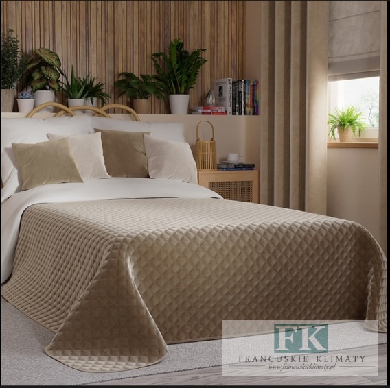 OPIS : Narzuta dekoracyjna z tkaniny velvetowej , pikowana w modny wzór geometryczny wykonany techniką hot press.