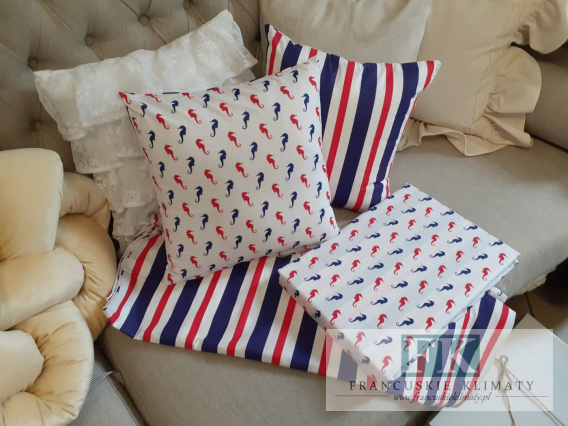 POSZEWKA NA PODUSZKĘ : 60 x 70 - 2 SZT ( z jednej strony  koniki morskie na białym tle   , z drugiej strony pasy na białym tle )
