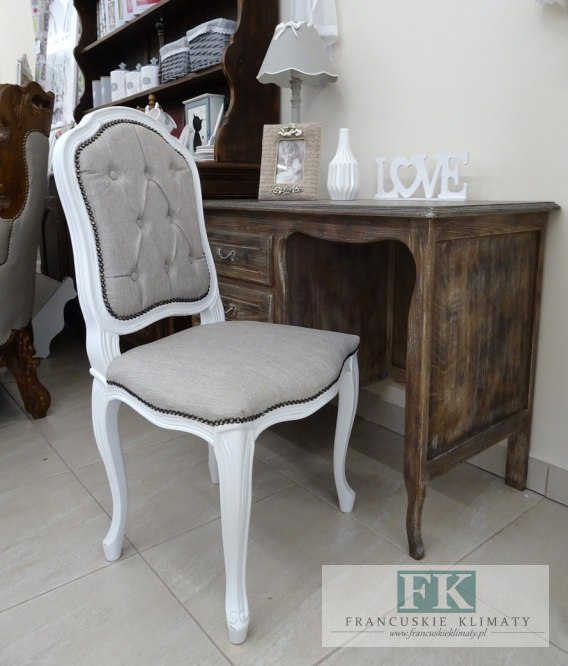 Krzesło jest nowe , w kolorze białym (ciepły odcień) stylizowane specjalną techniką celowych , delikatnych przetarć co wygląda niezwykle efektownie .