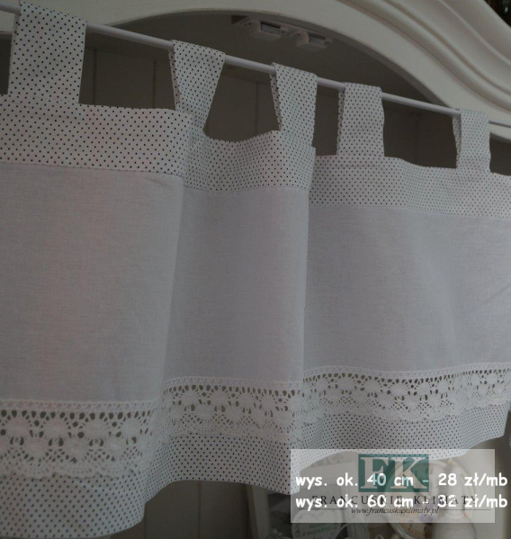 Zazdrostka wykonana na szelkach do zawieszenia bezpośrednio na rurkę karnisza bądź na patyk od zazdrostek.